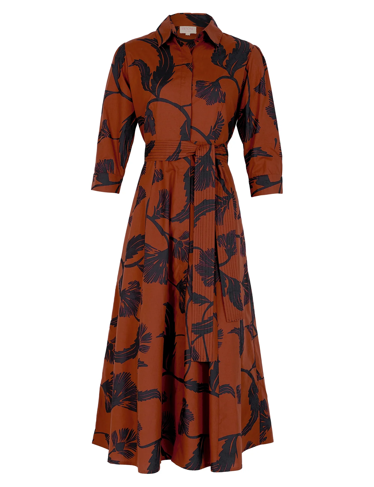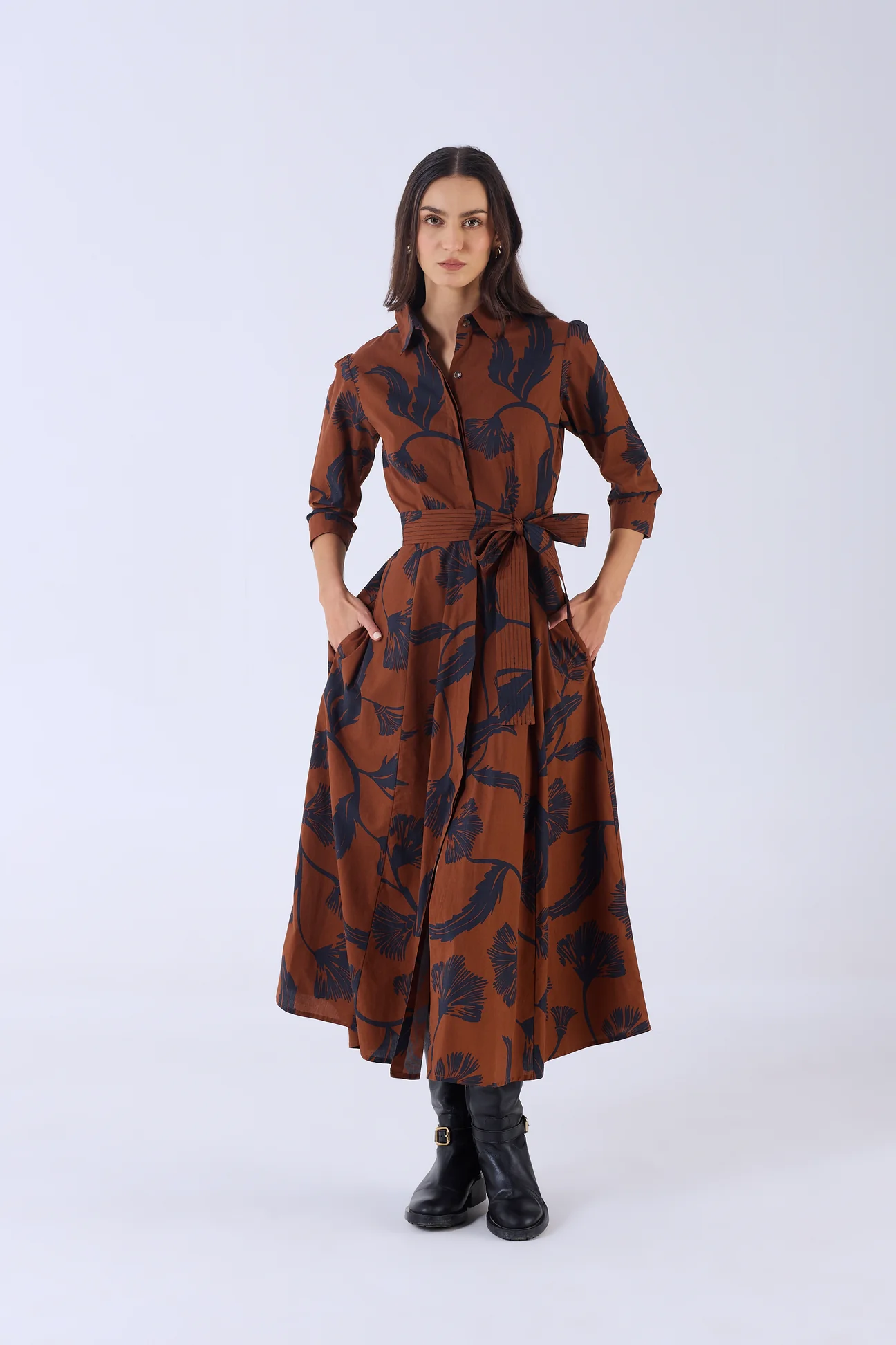 Our popular Emily is a classic shirt dress with an elegant ease and flattering, effortless silhouette. The dress buttons down at the front and features 3/4 sleeves. Accentuate the waist with the featured belt. Emily is crafted from crisp cotton poplin, breathable and soft against the skin. ‘Noir Bloom’ captures the graceful interplay of shadows formed by leaves and florals under the fading light of the setting sun.