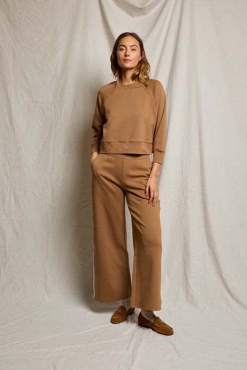 description: the mikos is a wide-leg pant designed with a clean silhouette and a sporty contrast stripe running down the side for a classic touch. crafted from a smooth travel knit that never wrinkles, it offers the comfort of your favorite lounge set while maintaining a polished look that’s ready for the airport or a long day out. pair it with the Nell sweatshirt for an easy travel set you can throw on without a thought.
