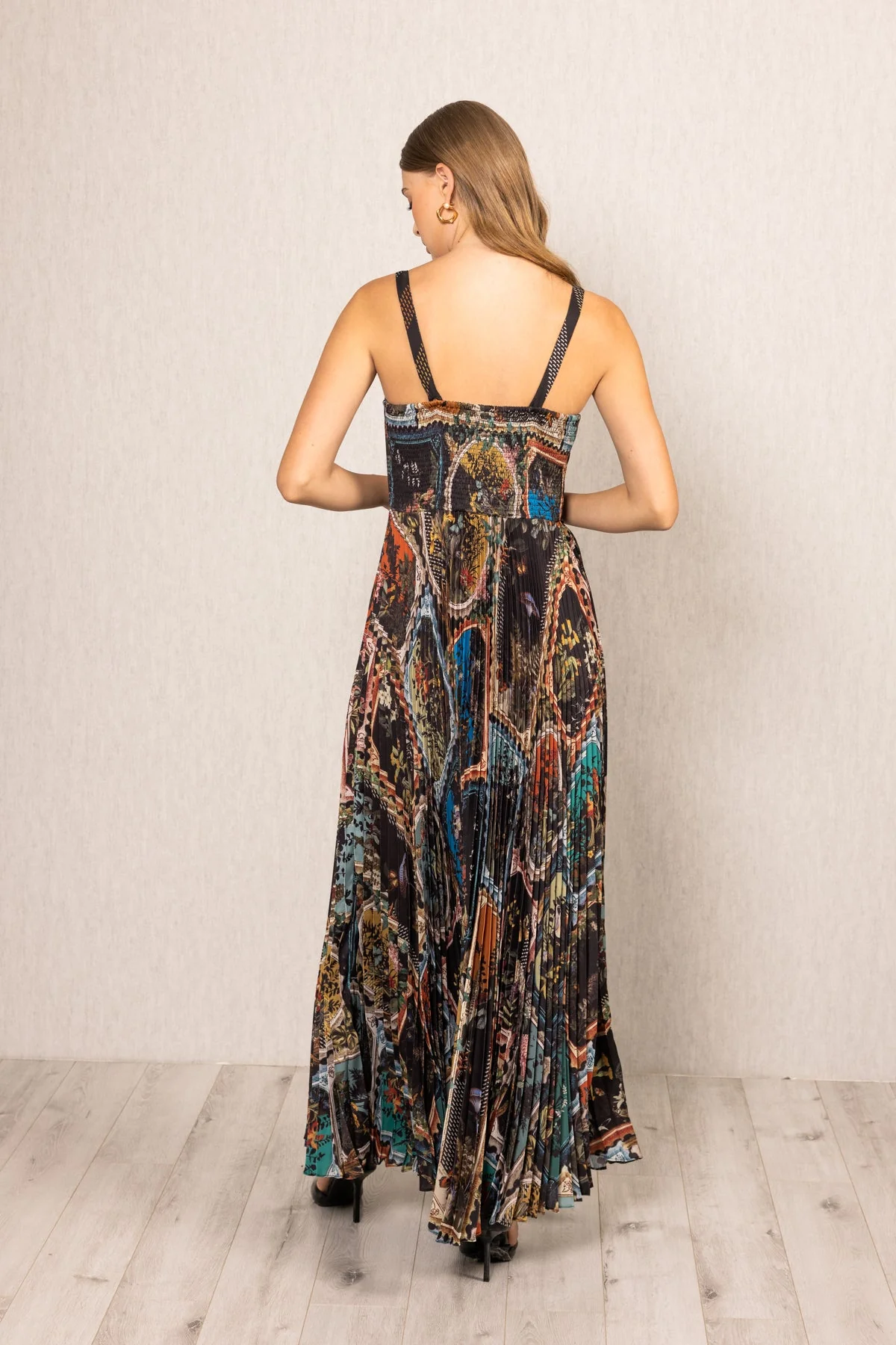 Step into statement mode with the Everly pleated maxi dress. this full-length silhouette is cut in poly satin and detailed with our signature Black Bouquet print, an expressive work of baroque frames, abstract motifs, and rich florals in deep, contrasting hues. Defined by its wide straps, shaped bodice, and sharp pleats, the dress falls with just the right amount of volume and shine.