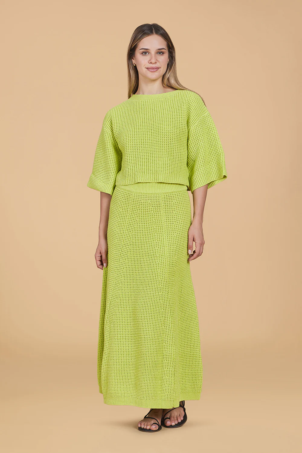 The Gerty Skirt is a bright knit that adds intrigue to any outfit. Designed with a ribbed waistband, it subtly defines the waist for a flattering silhouette. This maxi skirt offers both warmth and style, making it a versatile piece for cooler seasons. Pair it with a casual tee for a relaxed look, dress it up with a blouse, or the matching Wren Top.