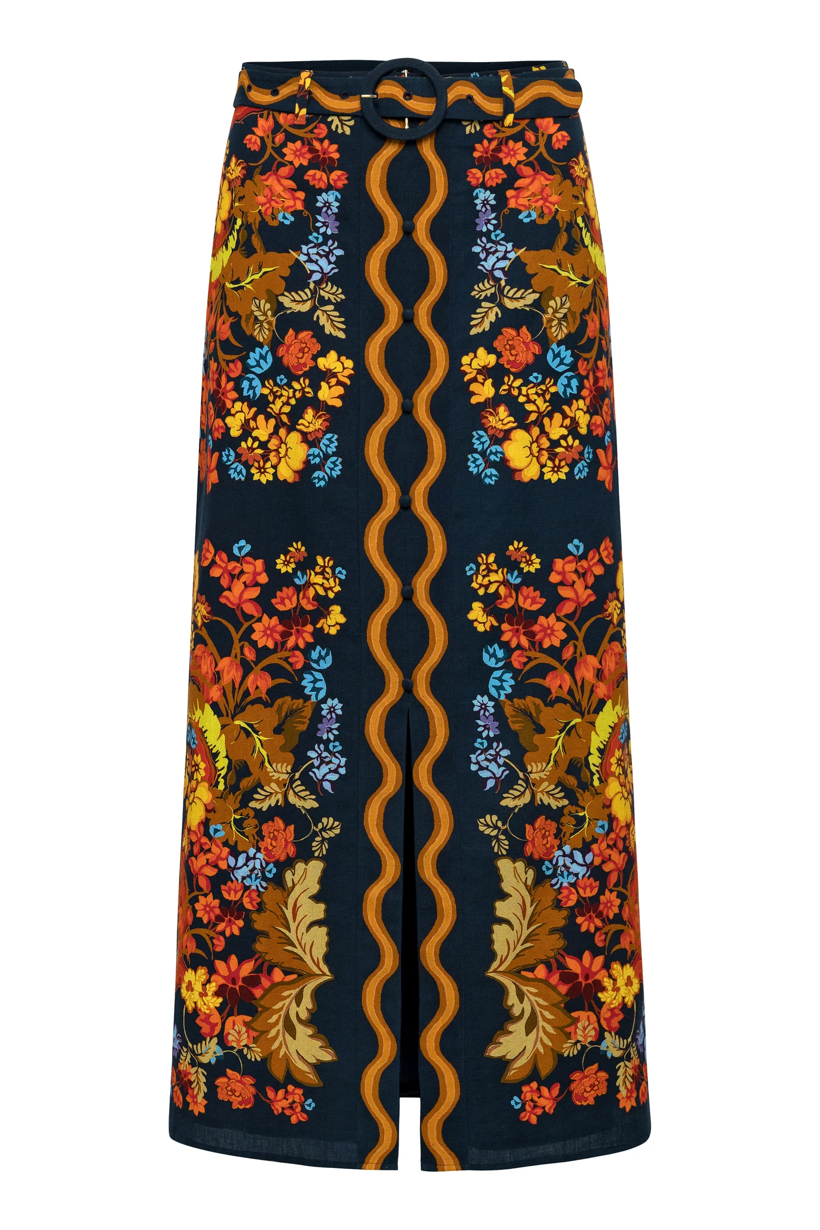 The Portia Skirt combines a sophisticated silhouette with a playful touch through its fun print. Featuring a elegant belt. front center slit for graceful movement and a discreet back zipper for a seamless fit, this skirt offers both style and comfort. Perfect for making a polished statement at any occasion.