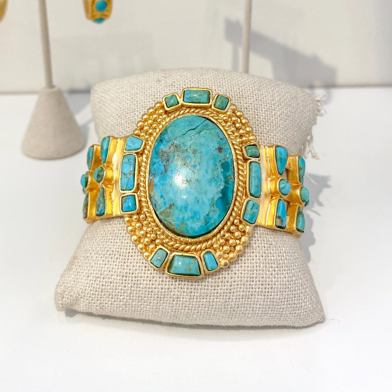 The Southwestern Cuff is a piece that’s sure to wow! The cuff is 18K gold plating over hypoallergenic and nickel free brass and features a large turquoise stone in the center surrounded by smaller turquoise stones. The Southwestern Cuff is adjustable to fit just about any wrist. You won’t need to wear any other bracelet besides this, and it goes perfect with our Southwestern Pendant. Details: