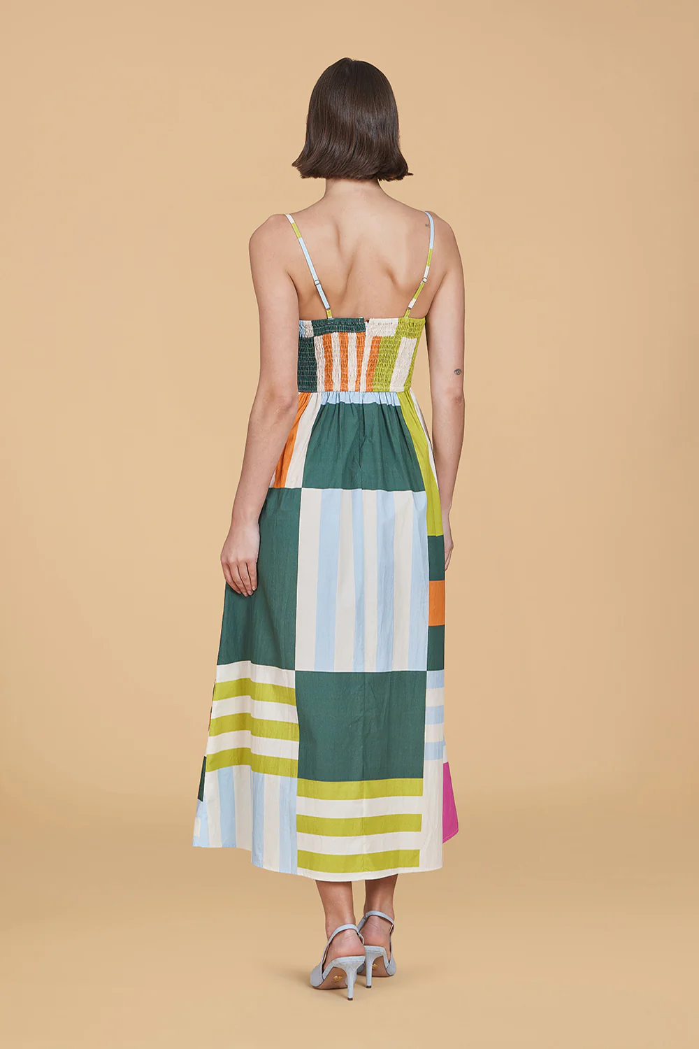 The Lillian Dress in Vista is the perfect vacation dress. With its vibrant colors and beachy silhouette, it is the perfect addition to your resort wardrobe. The Vista print is a graphic mix of stripes and blocks in sun-washed greens, blues, and clay tones. Vista is inspired by Palm Beach architecture and the coastal skyline, bringing a playful yet polished energy to the collection.