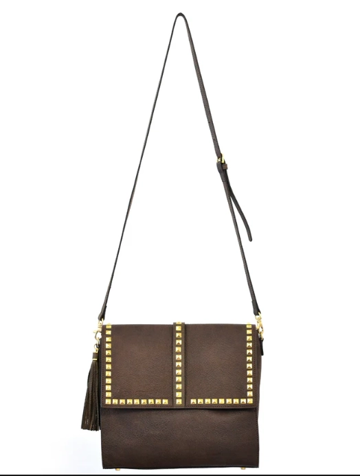 The Vera is where modern edge meets boho chic. Crafted from genuine Argentinian leather, this medium-capacity crossbody features bold gold-tone hardware arranged in a geometric stud pattern across the flap — a standout detail that instantly adds attitude to any outfit. The oversized tassel softens the look, giving it that effortless, bohemian touch that’s right on trend.