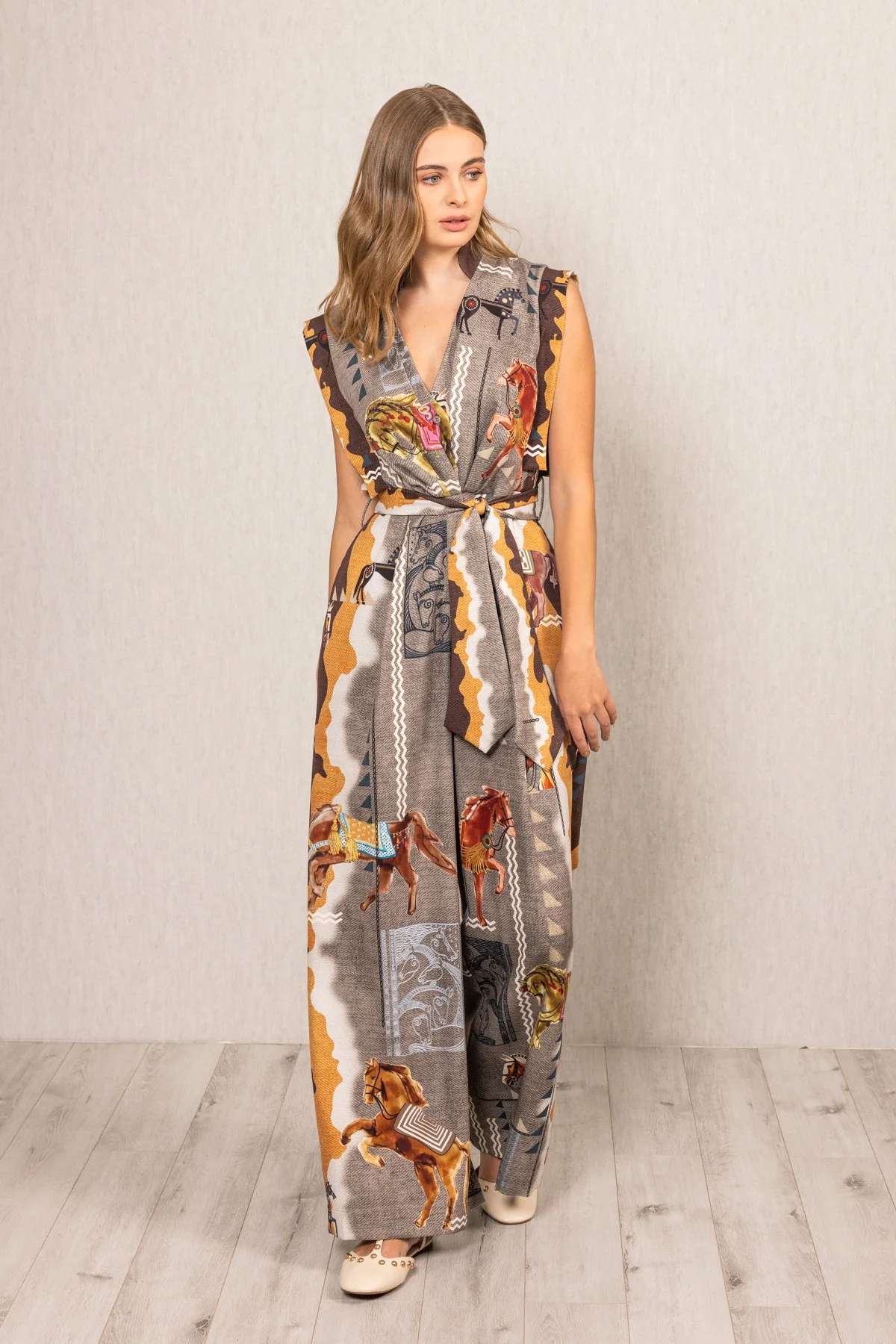 Introducing the Mirage Belted Jumpsuit. Crafted in a soft Crepe, this statement piece arrives in a warm stone-grey base with multi color work brought to life with our signature Irish Horse print, an artistic tribute to equine grace and strength. The silhouette features a sharp V-neckline, a relaxed sleeveless cut, and a wide-leg finish for elevated movement. A matching fabric belt cinches the waist, adding structure and definition. Designed with side pockets for added function, this jumpsuit merges standout printwork with sharp tailoring. Ideal for daytime edits or getaway styling.