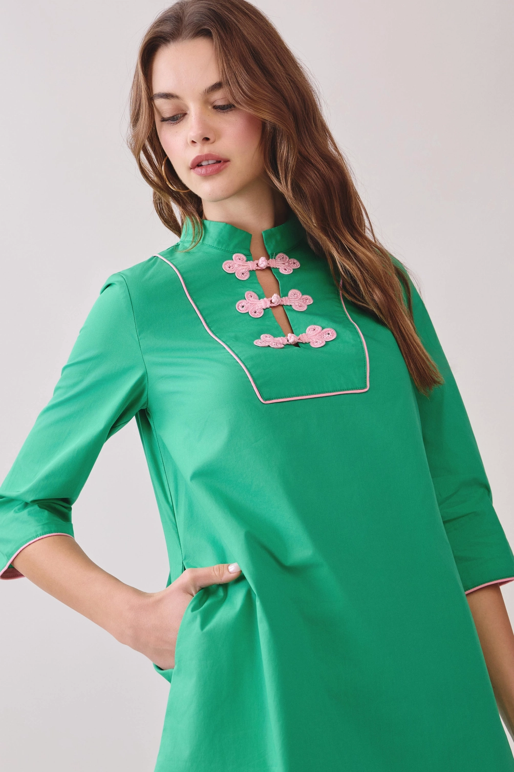 A mini shift dress featuring a mandarin collar and contrast frog button details. Designed with three-quarter sleeves and a straight silhouette. Finished with subtle contrast piping.