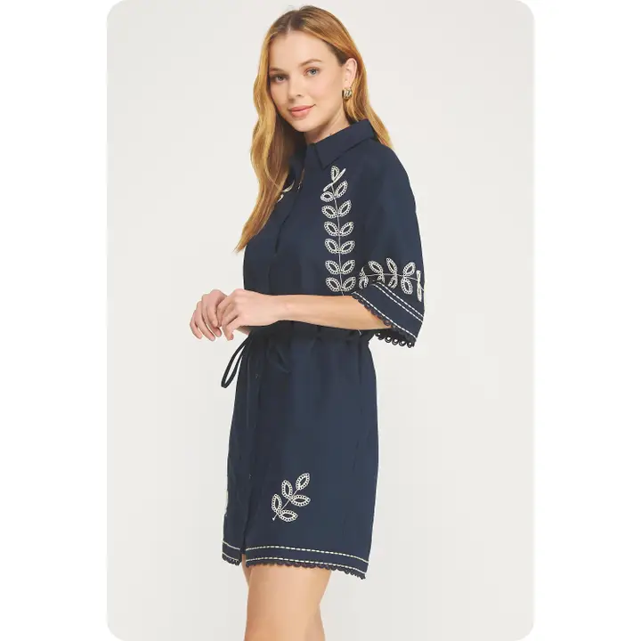 Embroidery Top Stitch Linen Shirt Dress - Dark Navy/Ecru