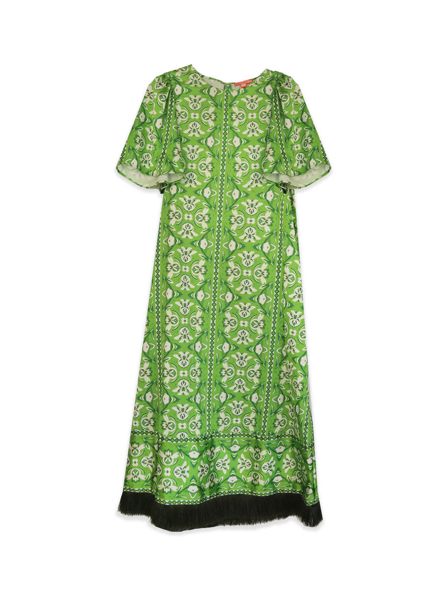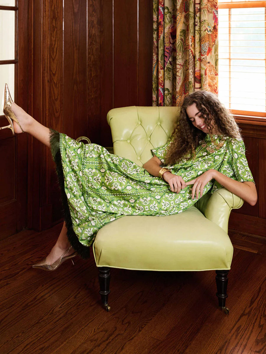 Effortlessly cool and quietly sophisticated, our Georgia Dress features a free-flowing A-line silhouette that flatters while it moves. Designed with graceful bell sleeves that offer elegant coverage and an ankle-skimming hemline, this piece brings ease and polish in equal measure. Crafted from a smooth poly-spandex blend and digitally printed in our original Fleur de Lune Green print, it’s finished with an olive green fringe trim for just the right touch of drama. Comfortable enough for all-day wear, yet bold enough to make a statement.