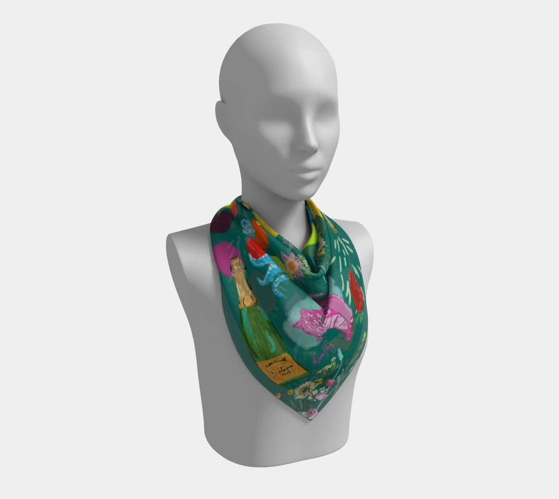 16" x 16", A whirlwind of Dorothy's mind these days all loaded up into one scarf for a bang of maximalism! Florals, stars, veuve, and rainbow tigers! Fluid and beautiful draped scarves are the perfect way to dress up any outfit and wear art where you go. • Made from 100% silk habotai • Smooth surface with low lustre • Print is visible about 50% on the back side • Each scarf is printed and sewn by hand in Montreal, Canada • Vivid print that will never fade after washing • hand wash in cold water with phosphate free detergent, hang to dry, iron on synthetic setting, may shrink after the first wash