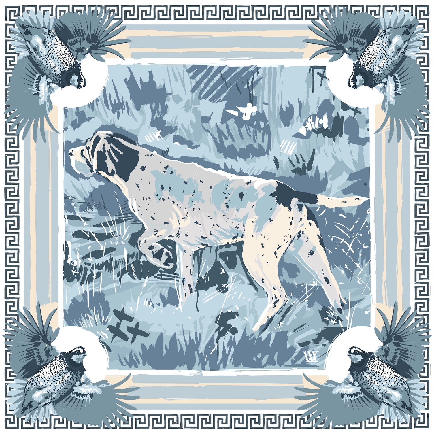 Details of the Light Blue Pointing Strong Silk Scarf Celebrate the timeless traditions of Southern field sports with this 100% silk twill scarf, featuring the Pointing Strong painting. The design centers on an english pointer frozen on point, framed by a classic Greek key border. In each corner, bobwhite quail burst into flight, echoing the sporting scene at the heart of the piece. Painted in cool blues, beige, and soft cream and white tones, this scarf combines elegance with a tribute to Georgia’s upland hunting heritage. At 35 x 35 inches with hand-rolled edges, it offers versatile styling—wear it as a statement accessory or display it as functional art. * 100% Silk Twill (14 mm) * Hand Rolled Edges * 35 x 35 inches