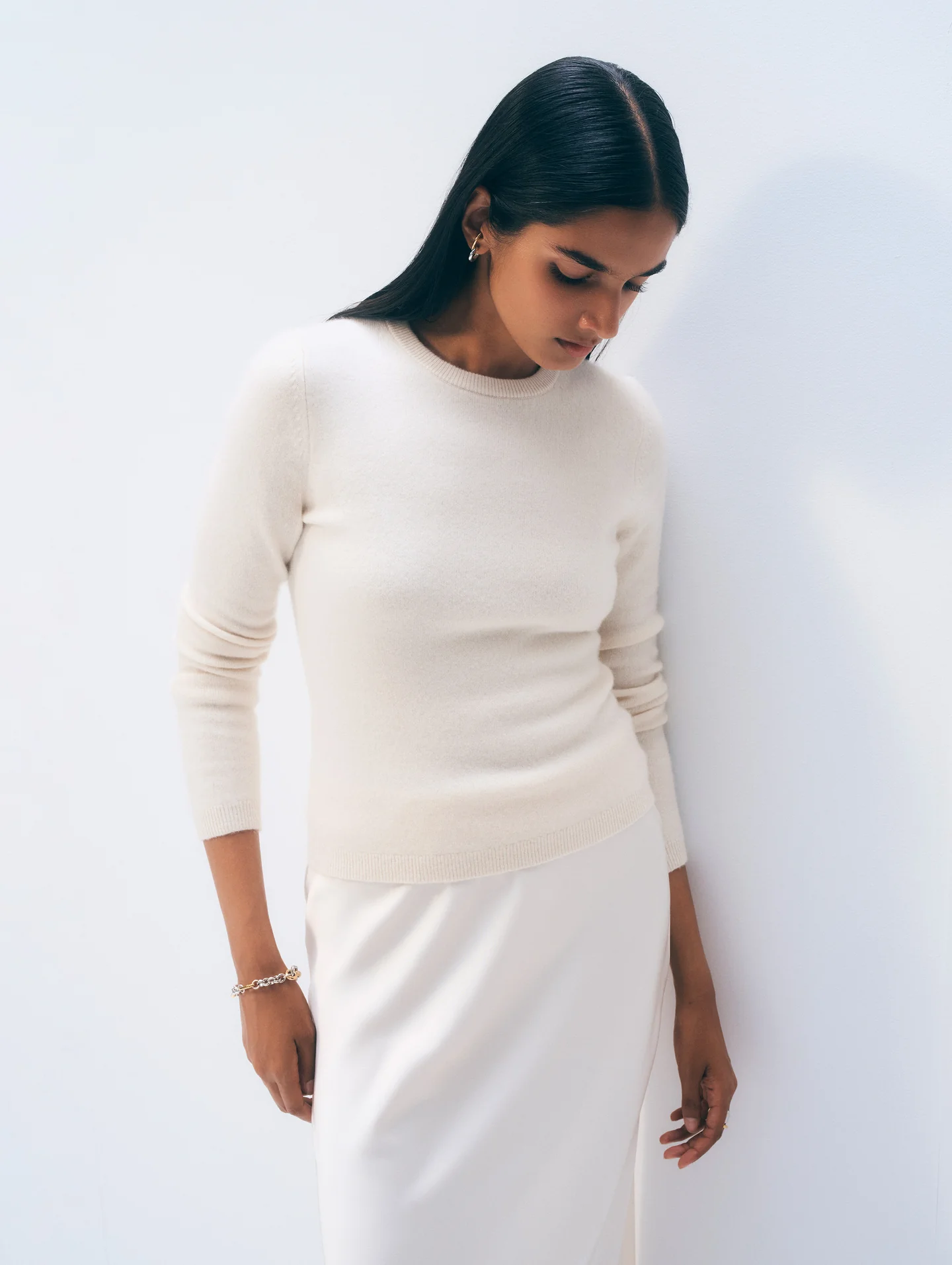 Knit throughout with Lycra, this cashmere crewneck sweater is designed for a slim fit that is as comfortable as it flattering. Featuring clean ribbed trims and a high-hip length, it's versatile enough for day or night wear. Pair it with high-waisted pants or tuck it into skirts for a chic, polished look.