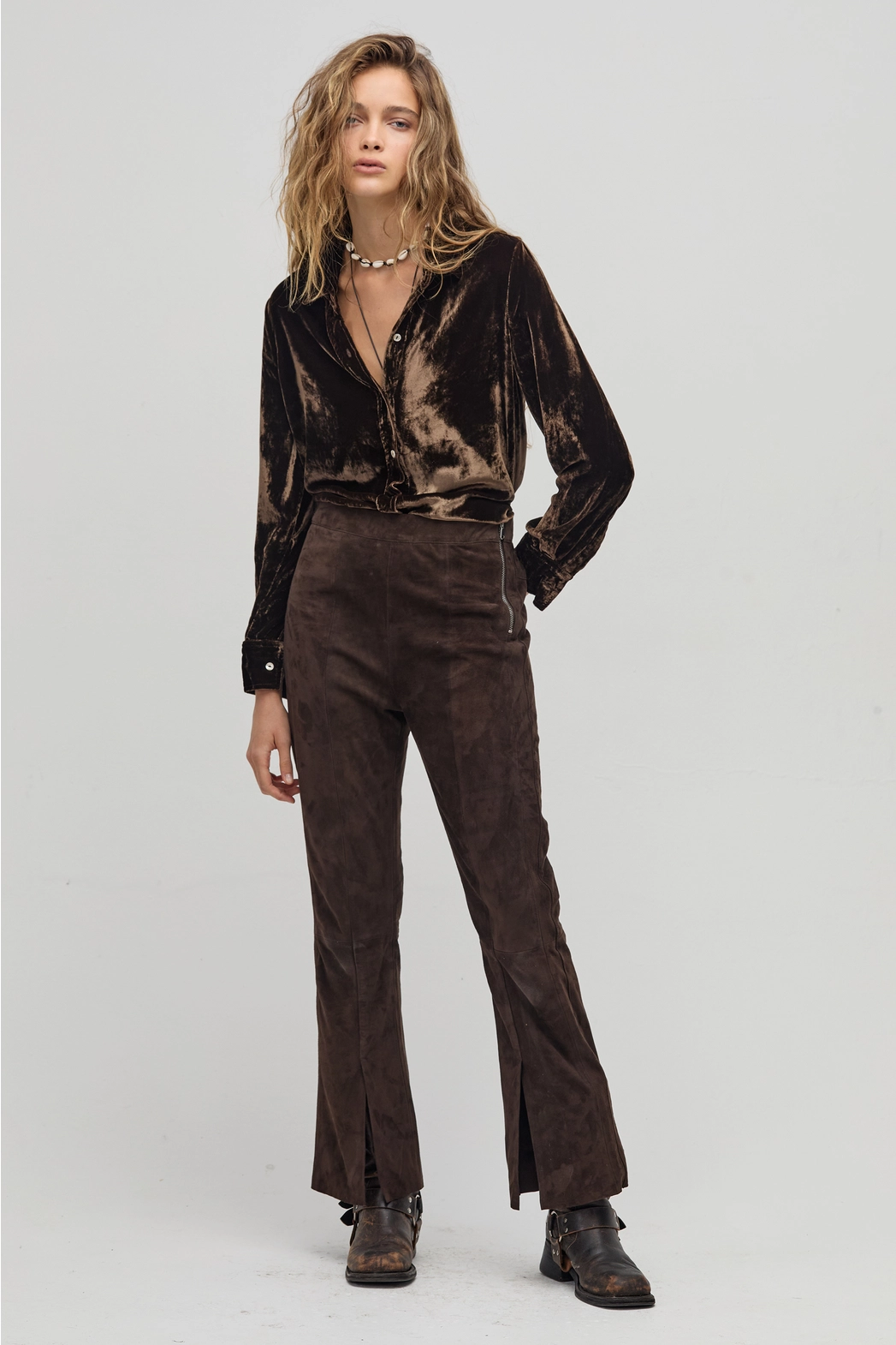 Our classic San Marino Shirt, now in the creamiest silk velvet for a super chic fall look. This elevated timeless shirt features a classic collar, button front closure with shell buttons, and long sleeves. It’s slightly longer on the back. Pair it with our New Luna Pants for an elegant yet comfy total look. DETAILS Style: VT-1237 * Velvet: 20% Silk 80% Viscose * Classic collar * Front button closure * Long sleeves * Pre-washed and softened * Made in Vietnam CARE * Delicately hand wash with cold water * Do not wring, do not tumble dry * DO NOT IRON, steam only * Dry clean SIZE & FIT * Regular fit * Model is wearing size XS