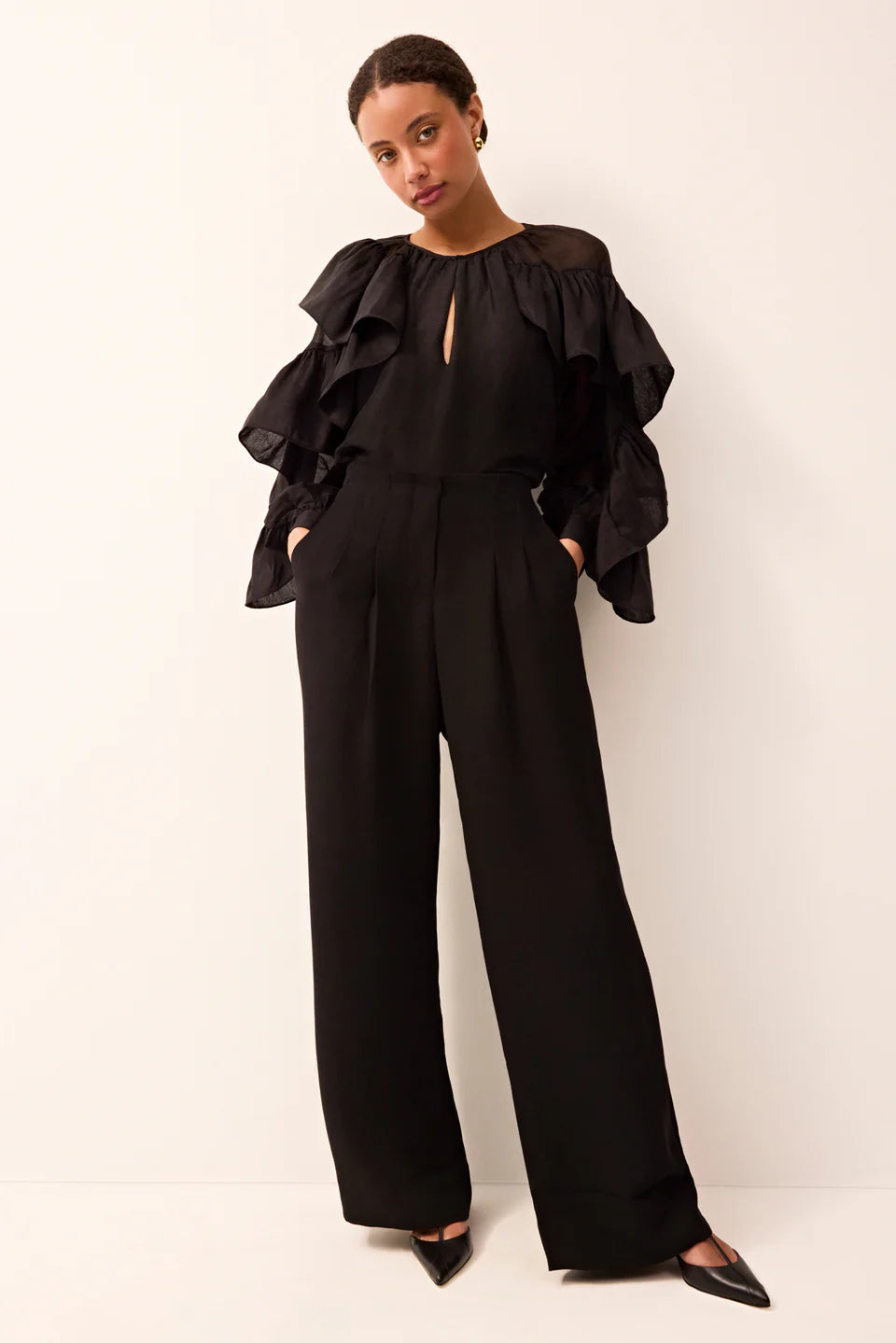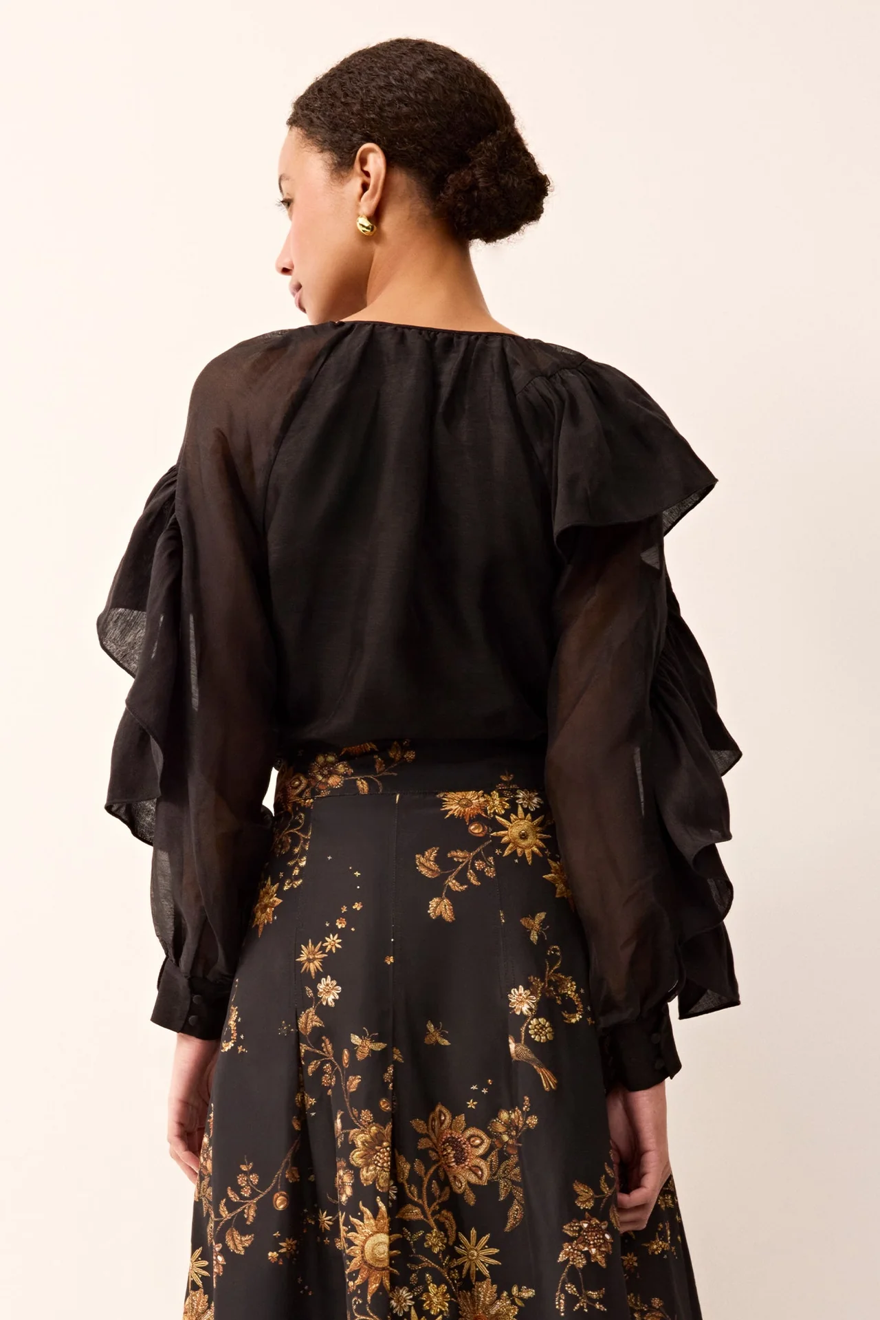 This airy silk blouse stuns in deep black with an assist from romantic details like full sheer sleeves with cascading ruffles from shoulder to wrist. Wear Warren alongside our staple Macbee pant for a chic allover black ensemble, or for maximum drama, pair Warren with Marie Oliver’s Faith midi skirt in our new Gilded pattern.
