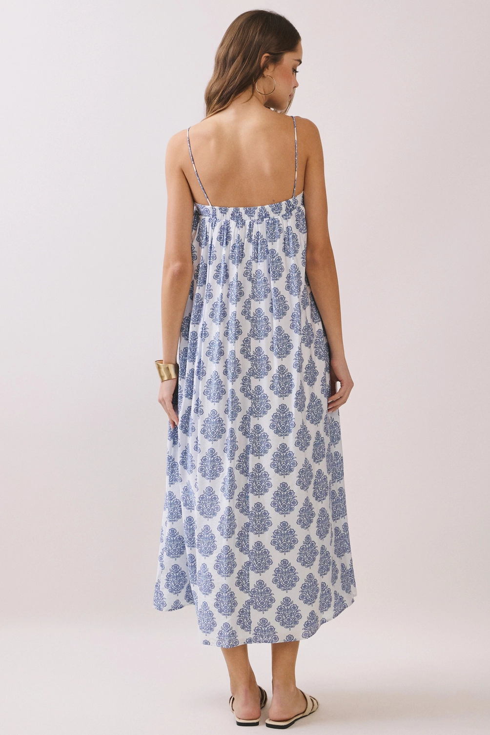 A printed maxi dress featuring a relaxed, flowy silhouette with thin adjustable shoulder straps and a straight neckline. Designed with soft gathering for added volume and movement. Finished with side pockets for convenience. Model Size + Fit: Model height: 5'11" Dress size: Small Bust: 31.5 Waist: 23.5 Hips: 35