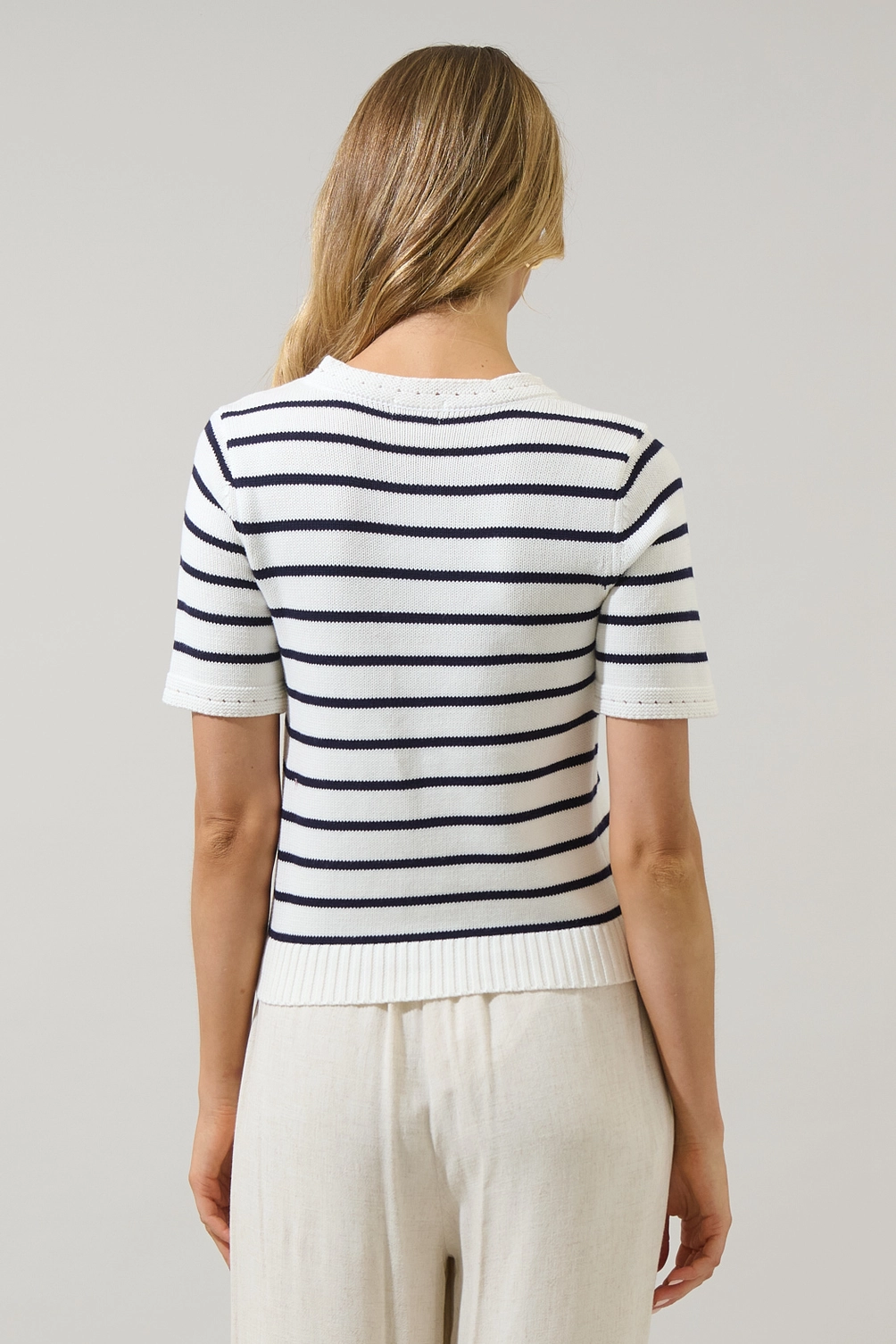Elevate your style with this chic, versatile sweater top. Featuring a round neckline, short sleeves, and ribbed detailing at the hem and sleeves, it offers a modern, structured look. The timeless striped pattern pairs perfectly with tailored trousers and heels for a polished outfit or denim and sneakers for a more casual vibe.