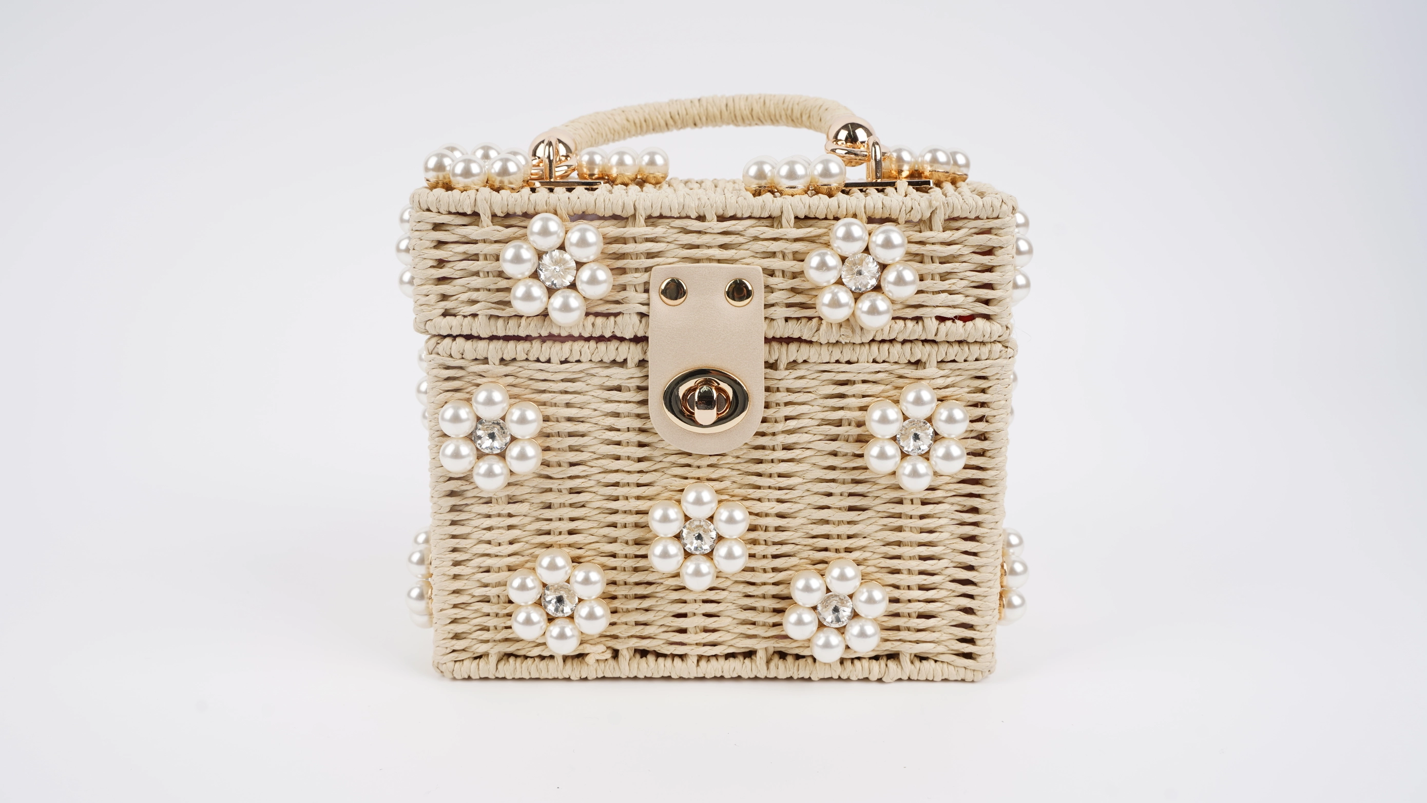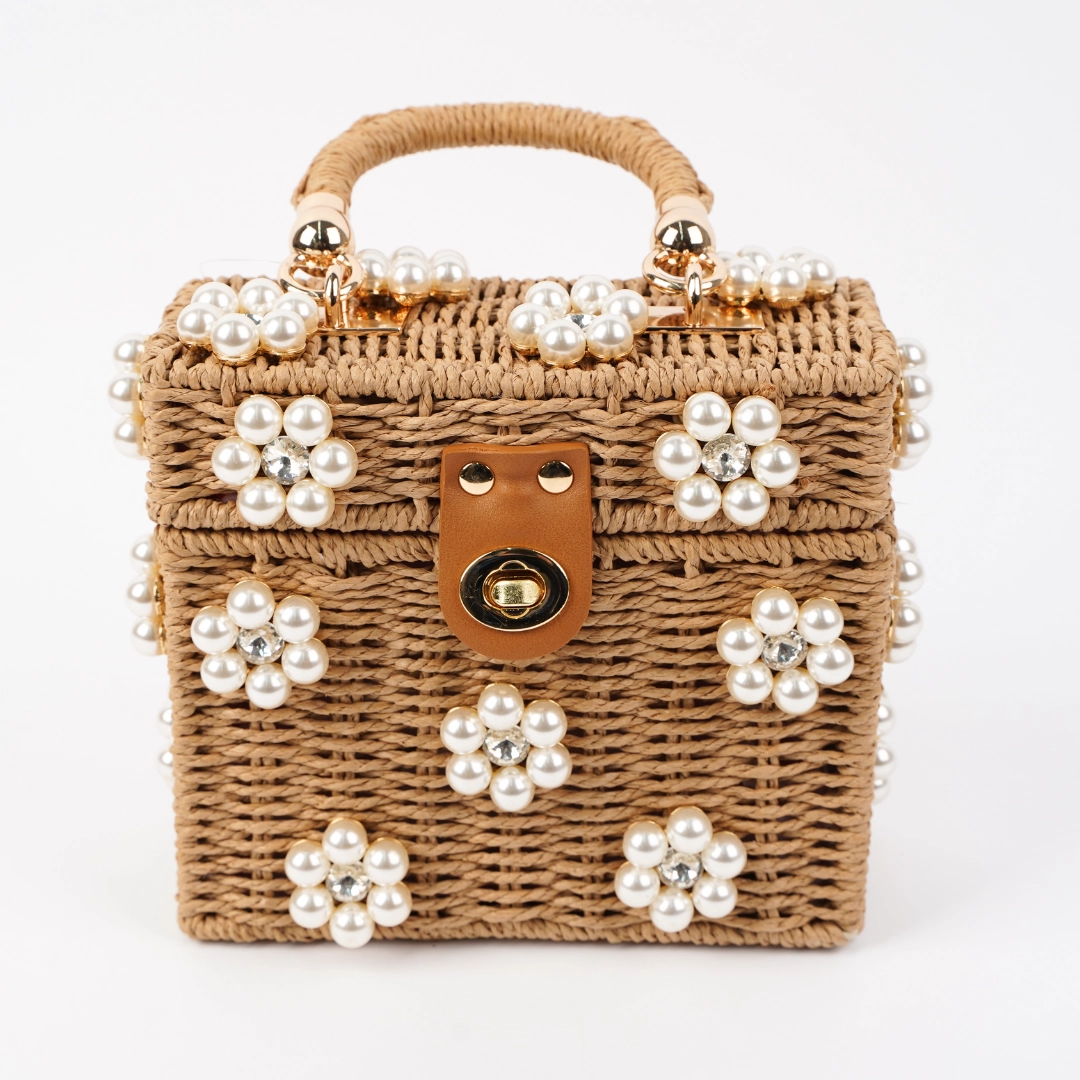 Wicker Bucket Bag with Beaded Flowers | Natural Woven Handbag with bejeweled flowers | Embellished Beach tote Basket with daisies | Straw floral daisy vacation Bag | raffia summer clutch for pool.