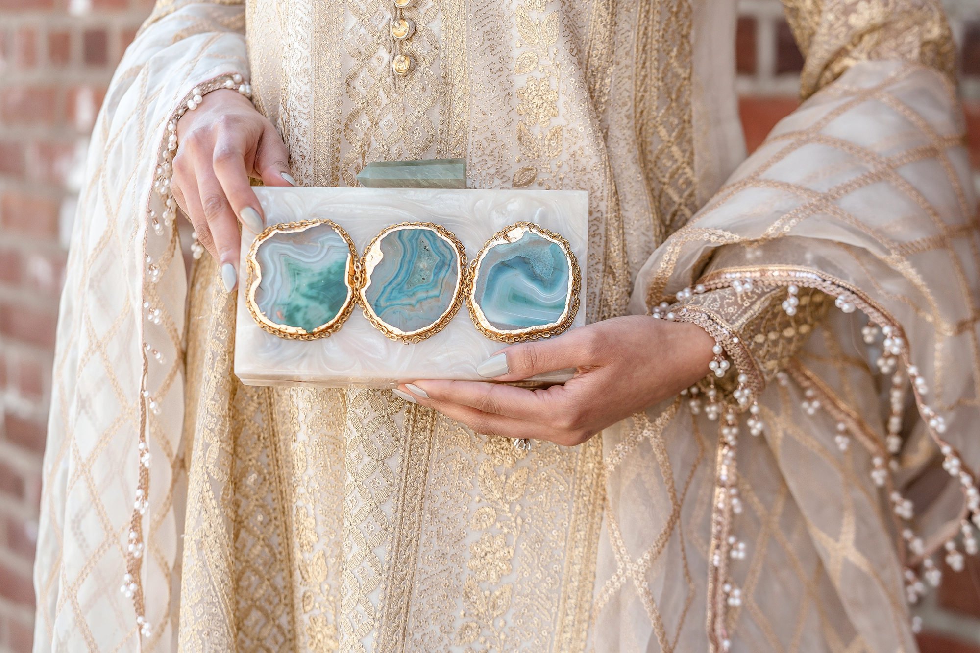 A simple yet classy approach taken on this beautiful resin piece.  Unique agate stone with golden drizzle makes it look elegant. Definitely a head turner when you pair it with your next outfit.  Comes with a golden sling inside  Big enough to carry all your essentials.