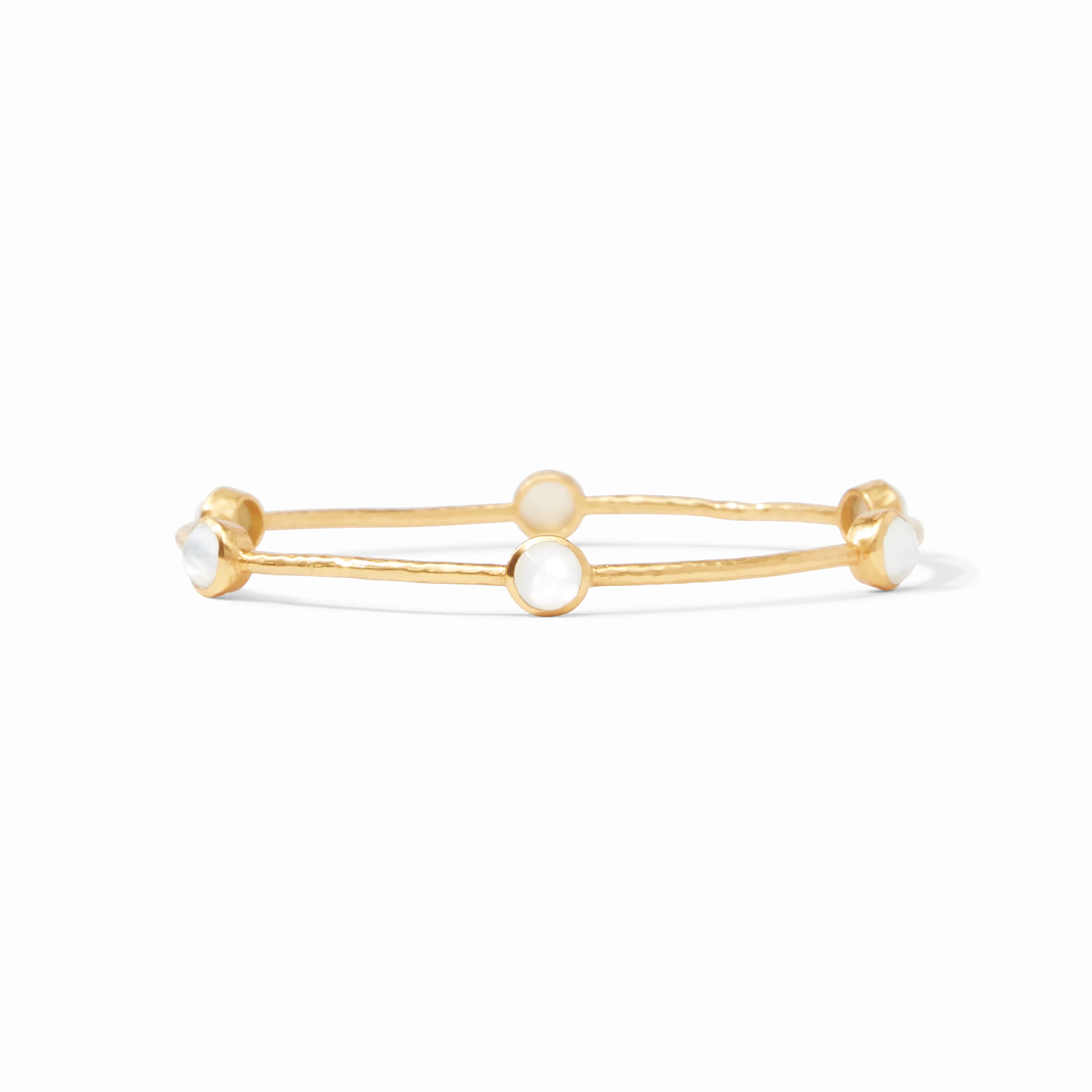 A lightly hammered bangle embellished with six iridescent gemstones stations