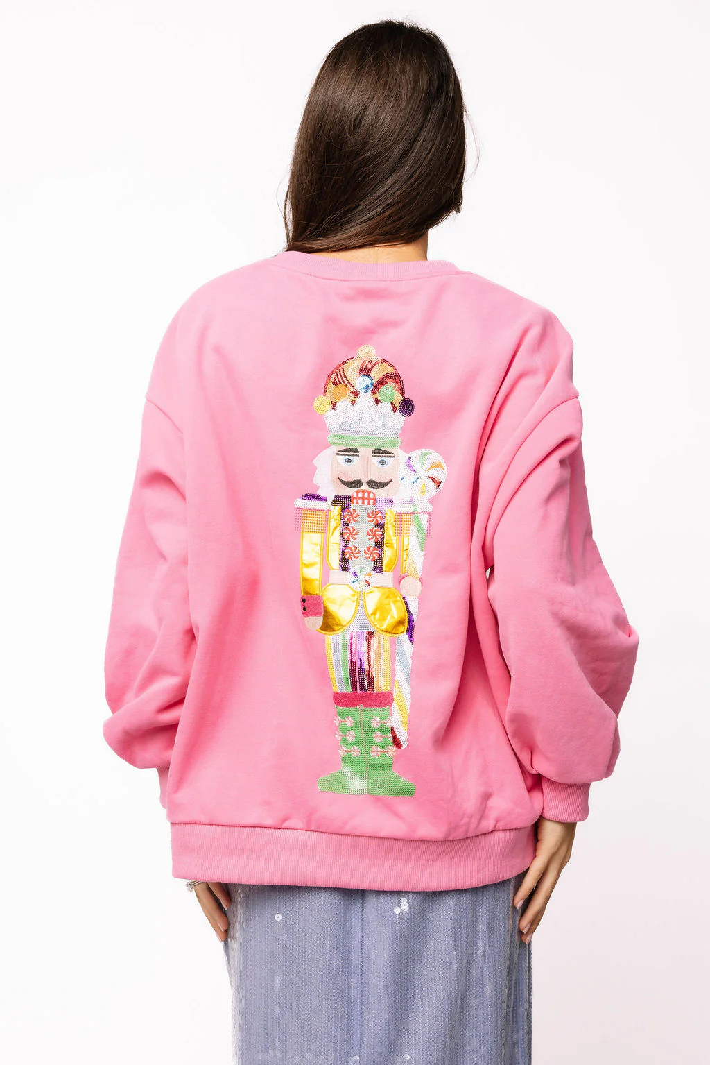 Embrace festive fun with the Pink Candyland Nutcracker Sweatshirt! This playful oversized sweatshirt showcases a dazzling nutcracker covered in sparkling sequins on both front and back, adding a sweet holiday vibe to your wardrobe. Cozy, eye-catching, and perfect for celebrating the season in style.