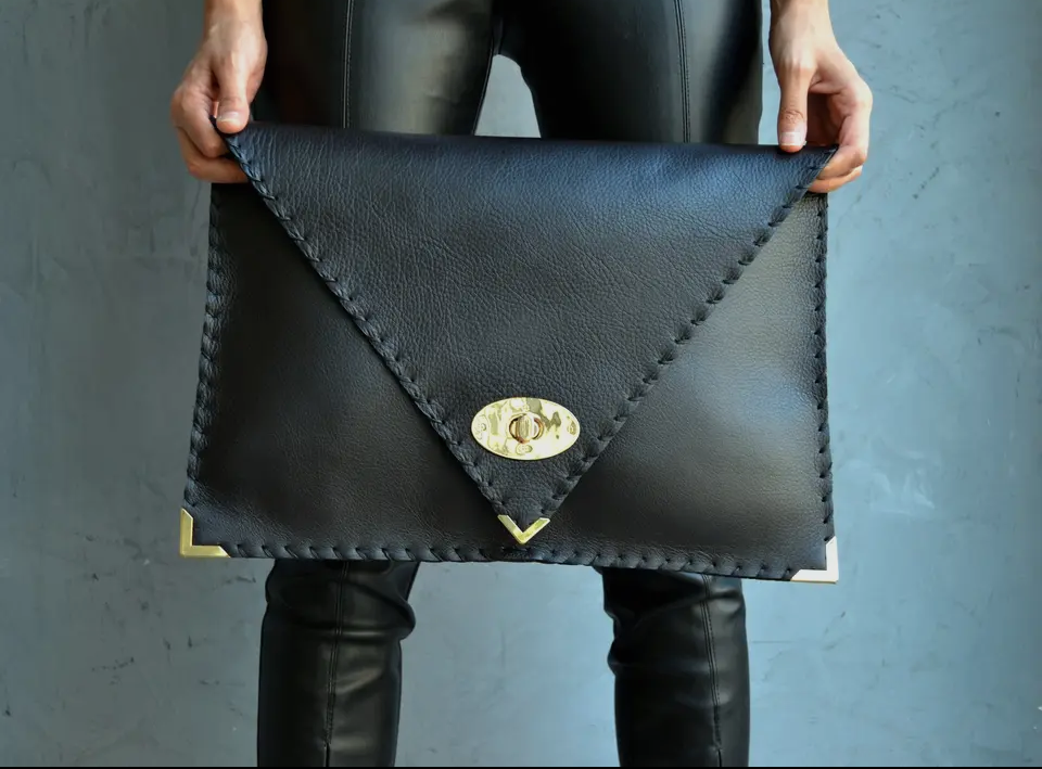 Symmetria black clutch. The perfect bag for all occasions! Ideal for cocktail and parties or for business meetings depending the size you choose. You can use it as a chic briefcase for your work or as a modern clutch for a night out. This adorable clutch is handmade out of a genuine Italian black calf leather. -Large size fits a 15" laptop, ipad, portofolio etc and it's perfect as a file folder or as modern a laptop case. It is hand stitched with black waxed thread. The interior is fully lined with leatherette. It can easily be cleaned with a slightly damp sponge. Large size comes with a leather pocket inside the bag. LARGE: Height 29 cm (11.42''), Length 41 cm (16.14'')