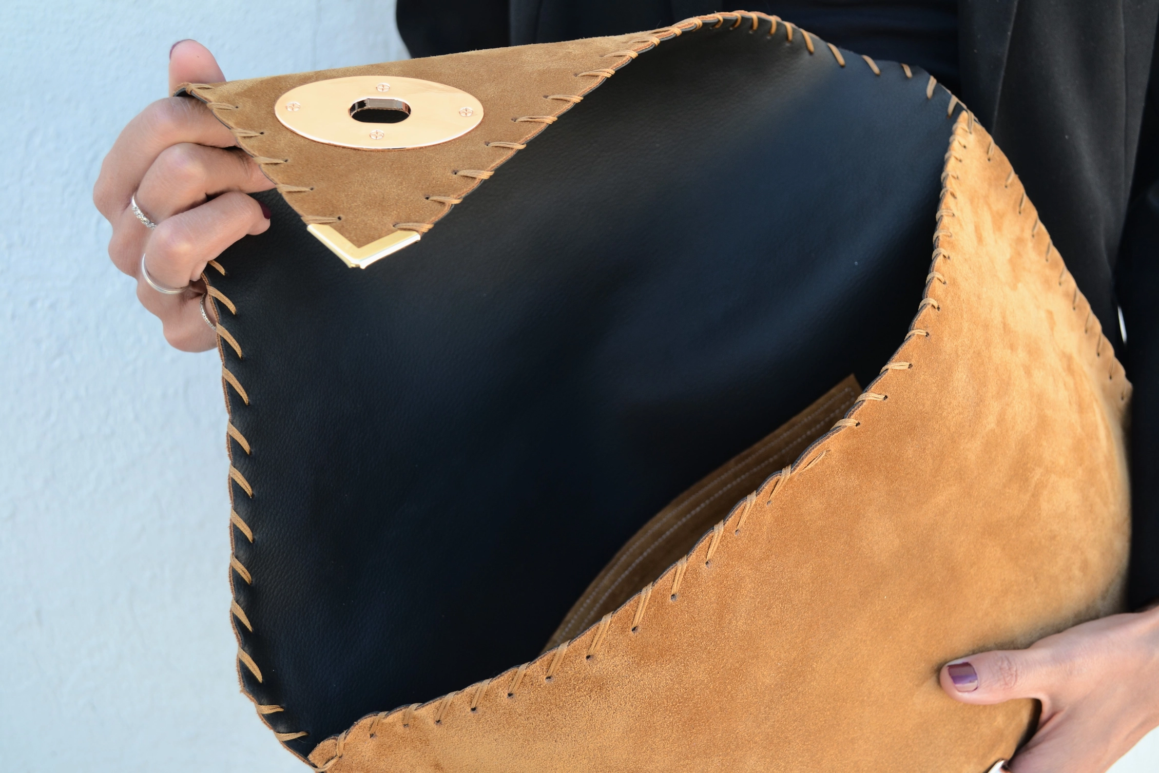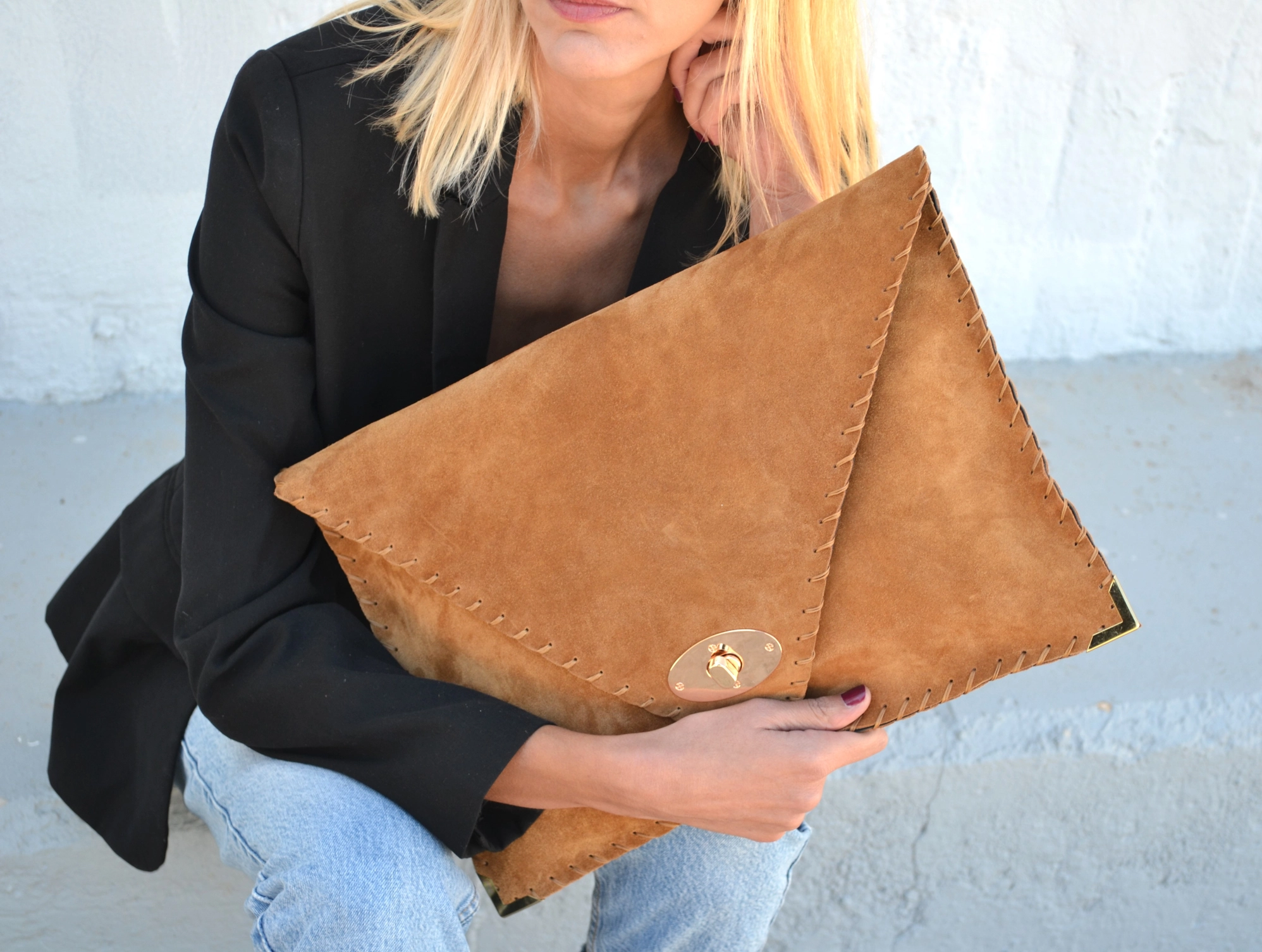 Symmetria large soft clutch in caramel.  The perfect bag for all occasions!  Ideal for cocktail and parties or for business meetings.  You can use it as a chic briefcase for your work or as a modern clutch for a night out.  This adorable clutch is handmade out of an Italian suede leather in a caramel color.  It fits a 15" laptop, ipad, portofolio etc and it's perfect as a file folder or as modern a laptop case.  It is hand stitched with waxed thread.  The interior is fully lined with leatherette. It can easily be cleaned with a slightly damp sponge.  All metal details come in gold or silver.  Inside the bag there is a suede pocket.   Dimensions: Height 29 cm (11.42''), Length 41 cm (16.14'')