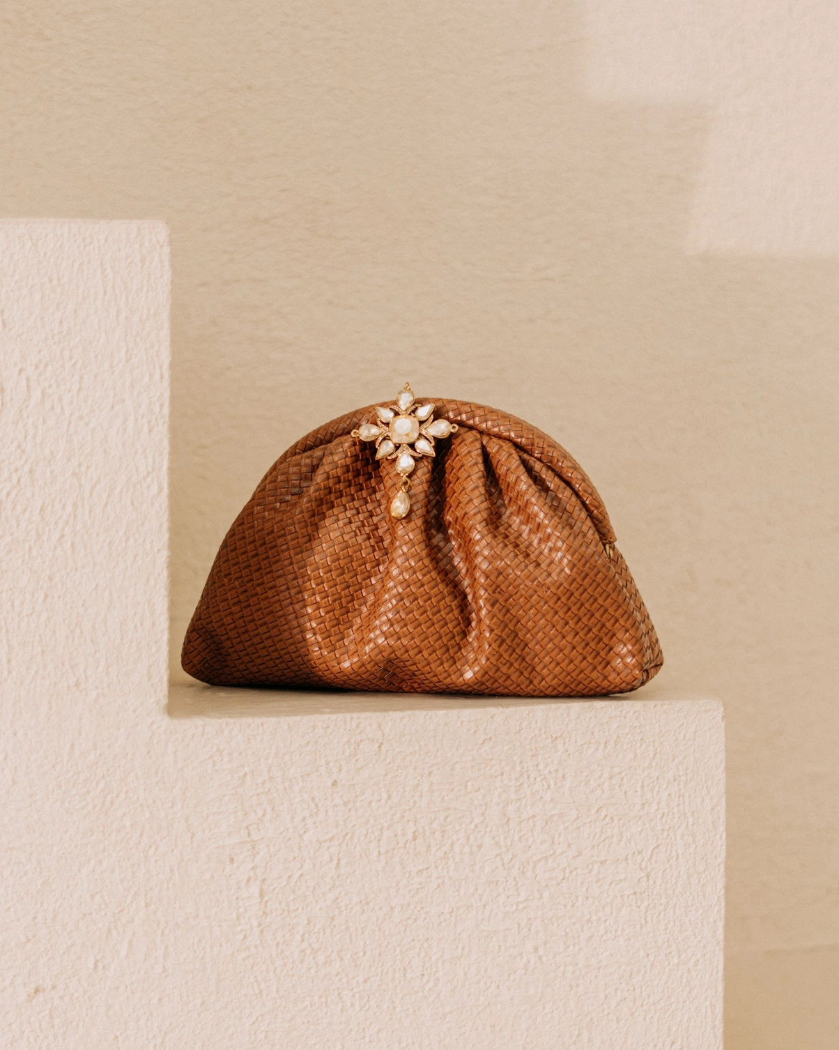 A perfect blend of texture and elegance, The Luxe Weave Clutch is crafted from rich, caramel-toned woven vegan leather, offering a soft yet structured silhouette. The gathered design creates a relaxed yet refined look, while the delicate gold and pearl floral embellishment adds a touch of vintage glamour. Designed for both versatility and sophistication, this clutch features a spacious interior with a secure magnetic closure, making it ideal for carrying essentials with ease. Whether paired with a formal ensemble or styled for an elevated casual look, The Luxe Weave Clutch is a timeless statement of effortless luxury.