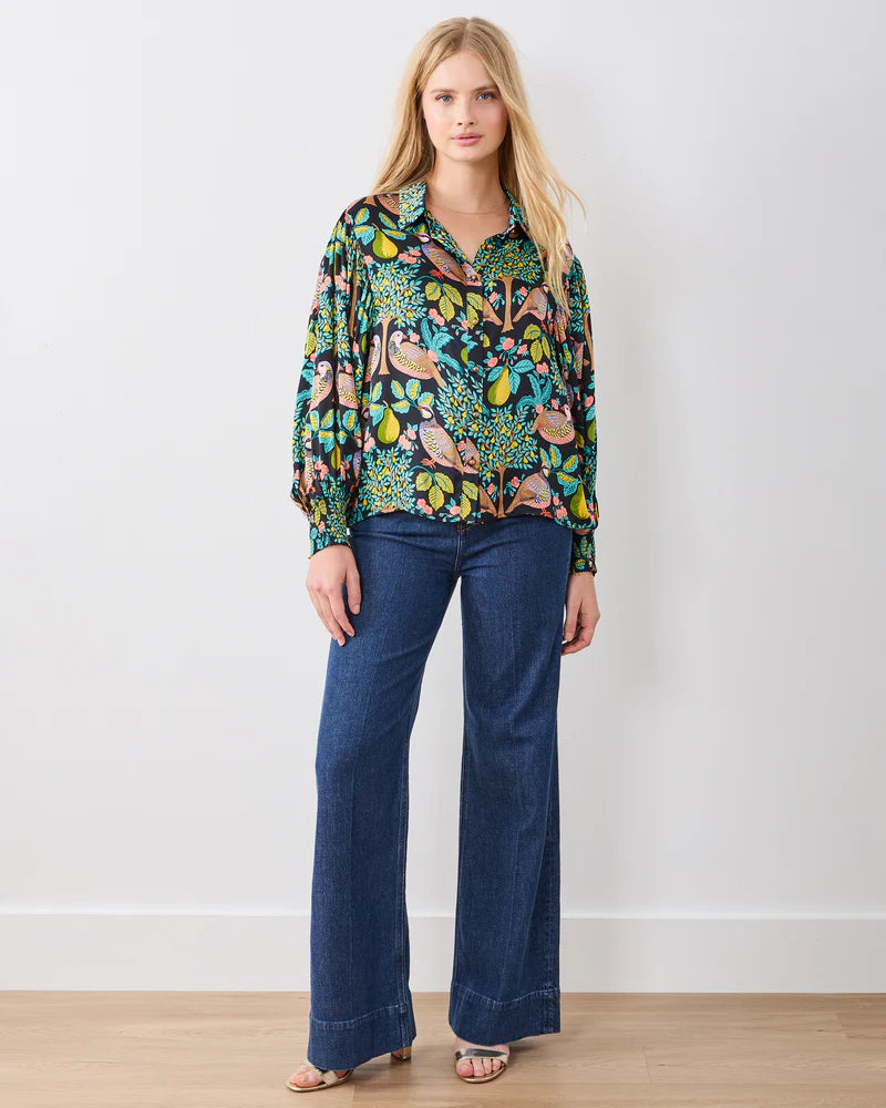 Ring in the season in our Anastasia holiday blouse. This elegant holiday top features our Partridge in a Pear Tree print on soft modal with a luminous sheen. The relaxed-fit festive blouse has a fully buttoned front and charming smocked cuffs. Perfect as a Christmas party blouse or for cozy gatherings with loved ones.