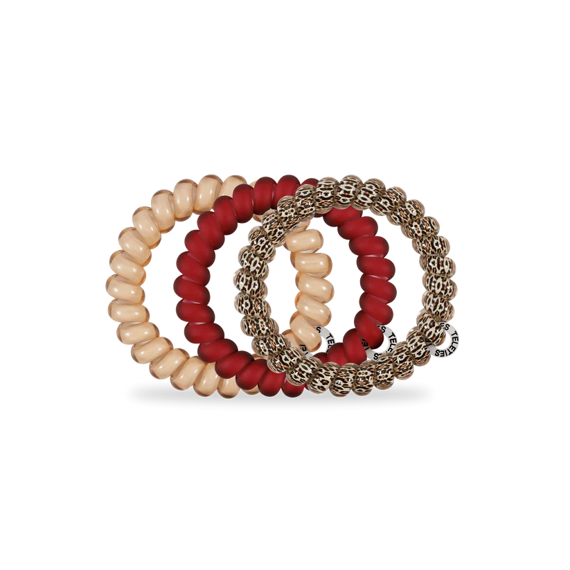 Wild SIde Small Hair Ties in Burgundy and Beige offer a strong grip without damage, doubling as a chic wrist accessory when not in use. Your new favorite hair essentials all year round.